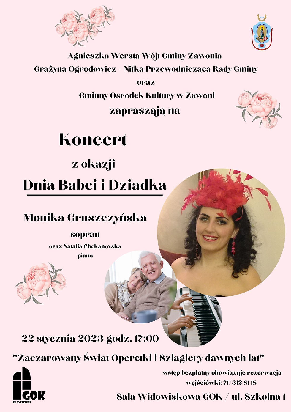 Zapraszamy serdecznie na Koncert z okazji Dnia Babci i Dziadka w niedzielę 22 stycznia o godzinie 17:00, wystąpi śpiewaczka operowa Monika Gruszczyńska, która pochodzi z Wrocławia. Jest wszechstronnie wykształconą absolwentką Akademii Muzycznej w swoim rodzinnym mieście. Uczestniczy w prestiżowych wydarzeniach muzycznych. Koncertowała niemalże w całej Europie, m.in. w Watykanie. Teraz jej głosu będą mogli posłuchać mieszkańcy Gminy Zawonia. Monika Gruszczyńska na scenie w Gminnym Ośrodku Kultury zaprezentuje największe przeboje okresu międzywojennego. Podczas koncertu usłyszymy "Miłość ci wszystko wybaczy", "Sex appeal", "Mały książę", "Powróćmy jak za dawnych lat" i "Już nie zapomnisz mnie".